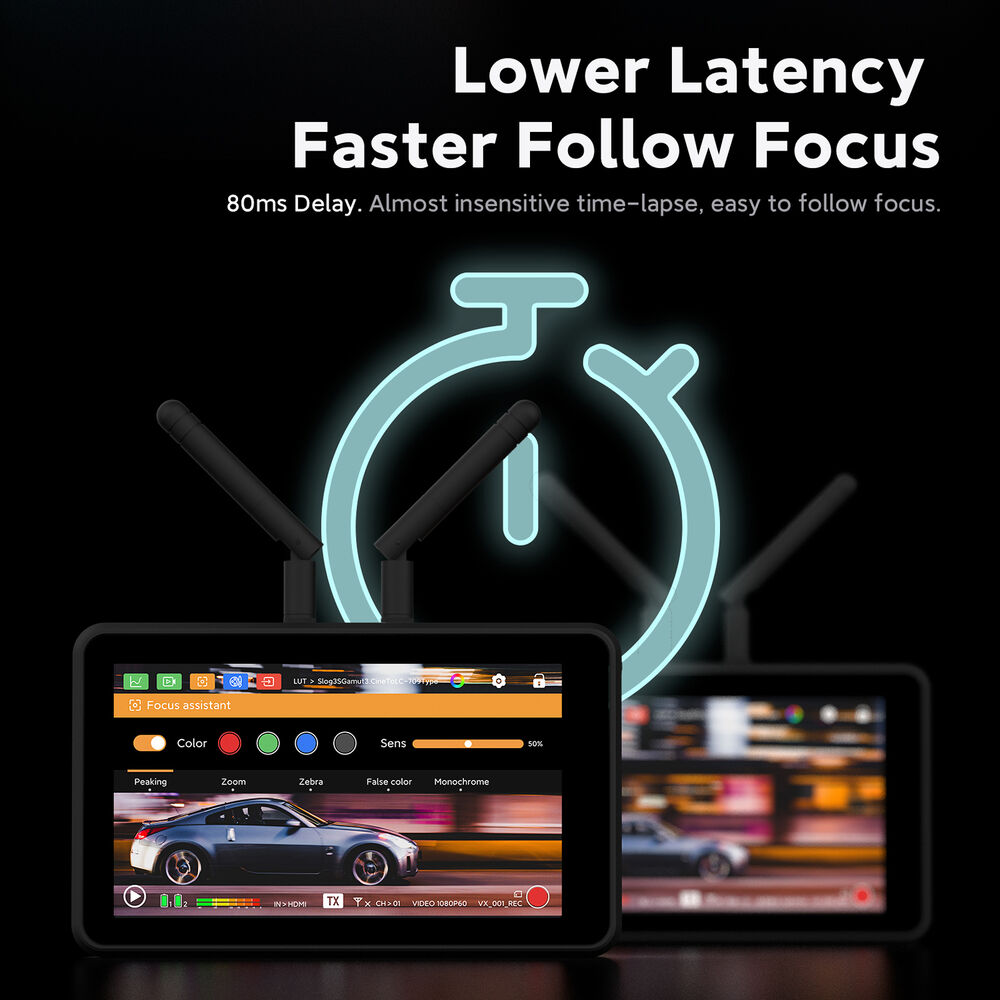 Its built-in wireless transmitter and receiver allow you to send and receive video between the Atom wireless transmitter/receiver ecosystem up to 492' away. It has enough sharpness to be a great companion for your wireless follow focus.